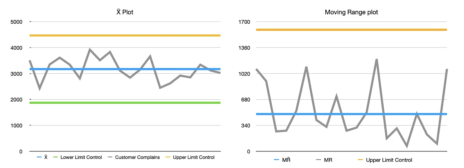 To make sense of your customer complaint data, we turn to Process Behavior Charts (PBCs), particularly the XmR (Shewhart’s Control Chart), which is notably effective. It consists of: