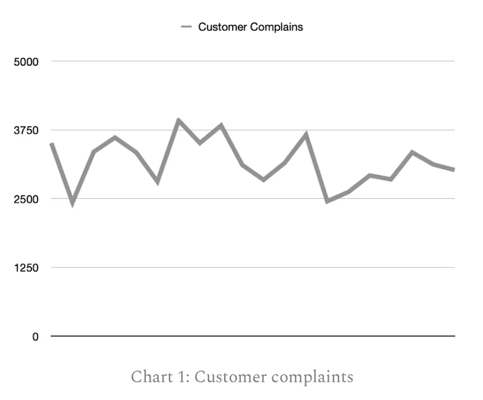 When looking at the raw data of a customer complaints chart, such as the one provided, it’s easy to see the fluctuations in numbers but difficult to extract actionable insights without further analysis. This chart alone, devoid of analytical tools or context, is merely a superficial representation of data. It doesn’t allow for an understanding of underlying patterns, trends, or root causes of the fluctuations in complaint numbers. Without deploying statistical tools or process behavior charts, any hypothesis about why complaints are rising or falling would be based on conjecture rather than evidence.