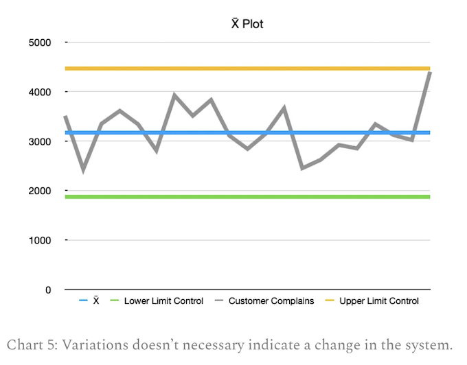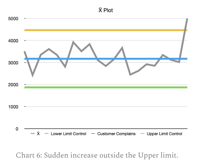 Control charts provide immediate visual feedback on whether a process is stable (in control) or if there are signs of instability (out of control). Chart 3 and 4 tell us that the customer complains for this service is completely predictable, and will fluctuate between 4467 and 1871 assuming nothing fundamentally changes with the process. As seen in Chart 5 below, if tomorrow you see an increase of complaints to 4400 you don’t need to panic as it’s still blew the upper limit Control.