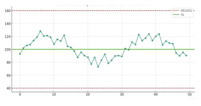 When the data shows a repeating pattern or cycle, this indicates that the process being influenced by systematic factors. These could be related to maintenance schedules, shifts in worker teams, or other cyclical factors.